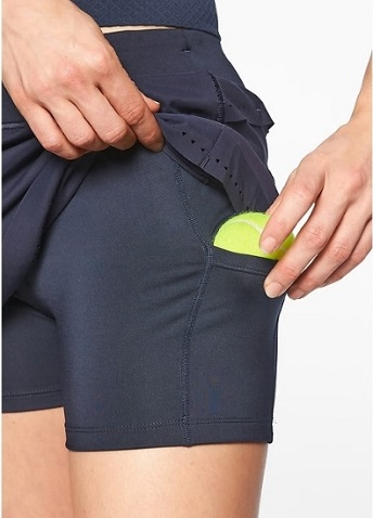 定義の通り、表向きはミニスカートに見えるが中はパンツ形状だ。パンツの周りに布が付いていると言っても良い。テニスで使われるスコートには内ポケットがあり、伸縮性のある素材でテニスボールを収納出来る。