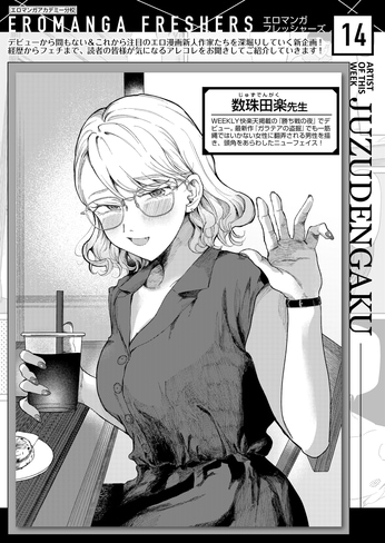 扉絵は「勝ち戦の夜」(Weekly快楽天 2025 No.10)の美濃はな先輩。「勝ち」と書いて「まけ」と読む。作中はビジネススーツから即ホテルでナマイキな後輩を食う話だが、本気の勝負服はメガネ付きなのが良い(ドリンクは多分ルートビア)。男女の関係性じゃないところからセックスに持って行くのが好きとのこと。一方でギャグセンスを磨いていきたいと。おしっこ×ギャグは既に巨匠がいらっしゃるので、鋭く切り込んで欲しい。
